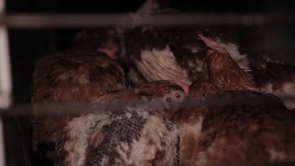Mice were running through cages containing hens, a number of dead hens were floating in a cesspit inside the building and we saw hens in very poor condition with feather loss and raw red skin.