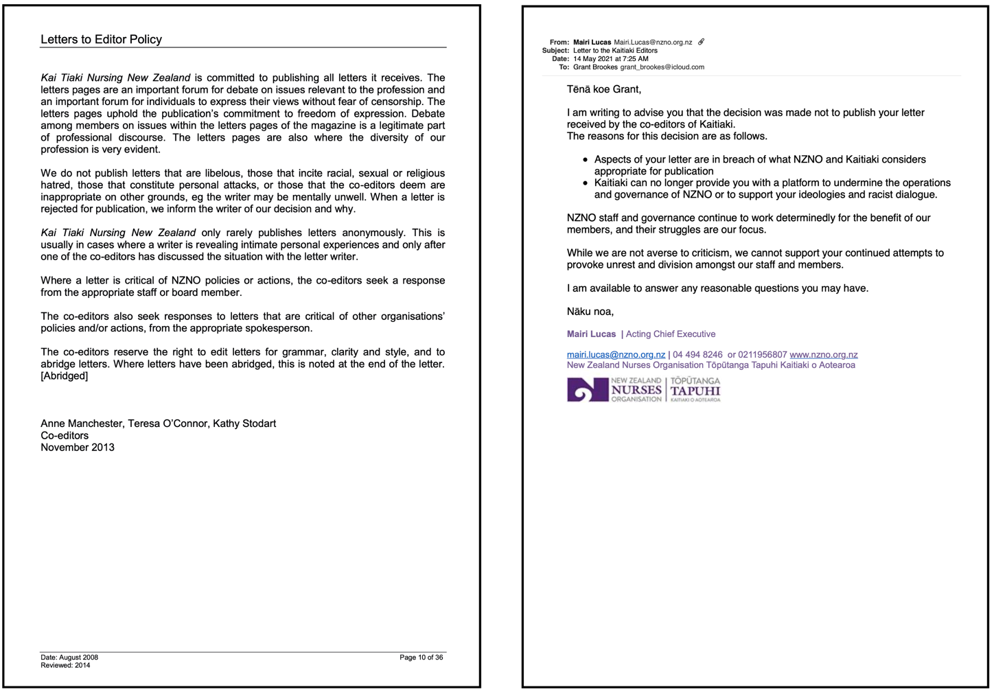 But no longer. On 14 May, the day that the DHB strike was announced, the acting CEO of NZNO sent an email. It wasn’t about supporting the strike. A decision on printing my letter to the May issue of Kai Tiaki, asking questions of the NZNO Board, had been taken out of the co-editors’ hands. I had been banned. The letters to policy and the CEO’s email are reproduced here side-by-side.