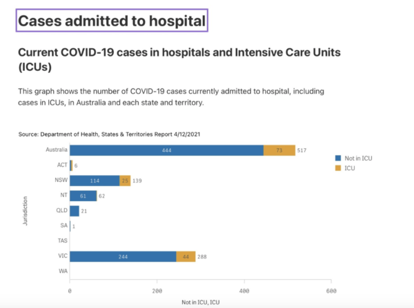 The Australian Department of Health, States and Territories regularly reports on a range of Covid-19 data such as daily infections and deaths. These reports also include hospitalisations (both in wards and in intensive care units).