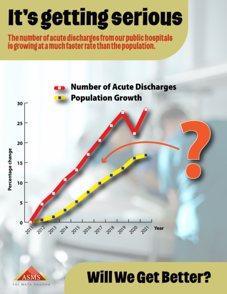 Since around 2014 the rate of acute hospital discharges has increased at a greater rate than population growth. This is a turning point for hospital occupancy by creating ‘bed-blocking’.