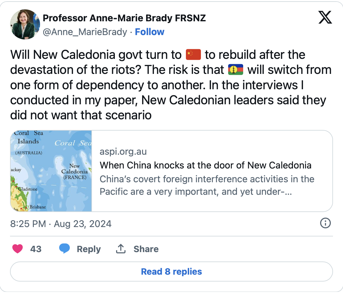 She argued that if New Caledonia were to become independent without France’s continued financial and security support it would “weaken regional security in the Pacific.” She said the independence coalition Front de libération nationale kanak et socialiste (FLNKS) would align closer with China.