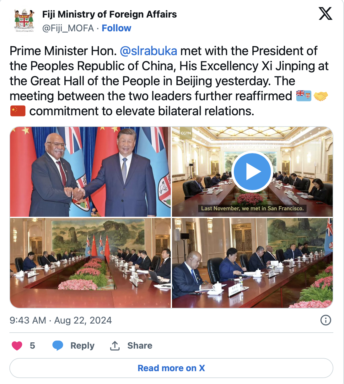 China hosted leaders of the Solomon Islands, Vanuatu and Fiji ahead of the PIF summit. The visit of Fiji’s Rabuka, who met Chinese President Xi Jinping in Beijing last week, came after Google announced it would build a $US200 million data center in the country to support a new subsea cable.