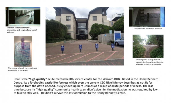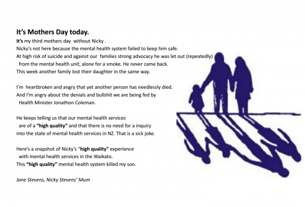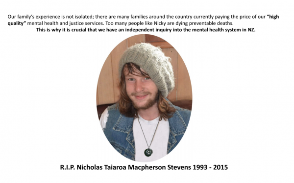 Mother’s day has become a day of anguish for our family since our son Nicky Stevens died while in the legal care of the Waikato DHB. This last week has been particularly difficult as we have had to witness the death of another young person in similar circumstances to our son. Our Mental Health system is failing too many of our young people. I have become increasingly distressed at the comments by our Minister of Health that our mental health system provides high-quality services. Our son would still be alive today if he had received a high quality of care by Waikato DHB. Here is a brief visual diary of my son’s journey through our “high-quality” mental health system.