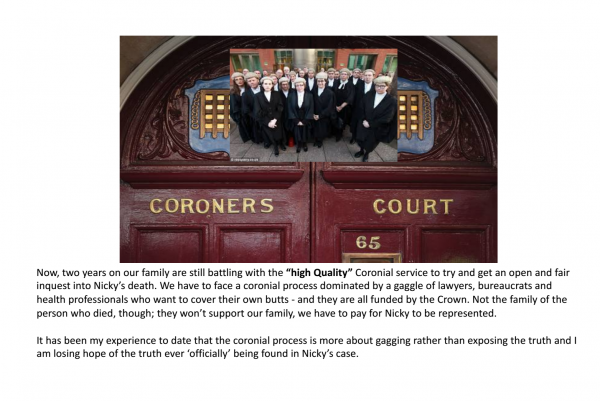 Serioulsy, why hasn’t Andrew been banned? I totally relate to what Jane is saying and I know how hard they are fighting to get an inquest, I did too. My son would also be alive if there was ANY standard of mental health care, but there just isn’t. Our hospitals are staffed by amazingly incompetent people passing themselves off as professionals. Then, when their incompetence kills the children of other people, they are able to hire the best legal representation to absolve themselves of any responsibility. I fought for 4 years to get an inquest into the preventable death of my own son, it was presided over by a coroner who was determined to whitewash the crimes of some govt employees. I haven’t finished with them yet.