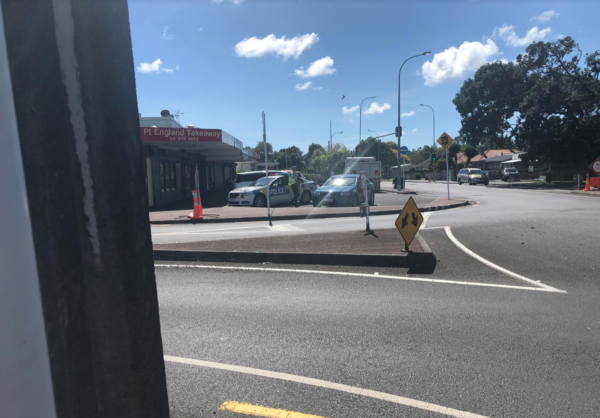 Two heavily armed Police have patrolled a dairy shop complex in Pt England where the local population is overwhelmingly Polynesian. Hundreds of kids walk past these officers, on their way to Tamaki College.