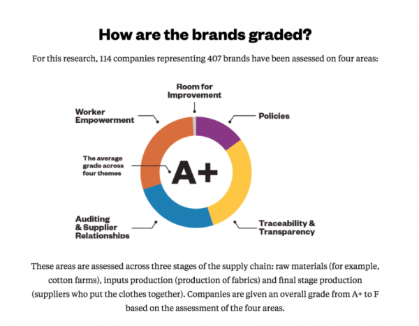 The 2018 Tearfund Ethical Fashion Guide was recently released. This report tracks the systems that companies have in place to uphold the rights of workers and to trace the supply chains of garments from the cotton field to the final product. Ultimately, the business/brand receives a grade from A-F, indicating the ethical standard of the company. This grade aims to provide information to consumers that wish to make informed purchasing decisions, a similar concept enforced at restaurants to grade health standards.