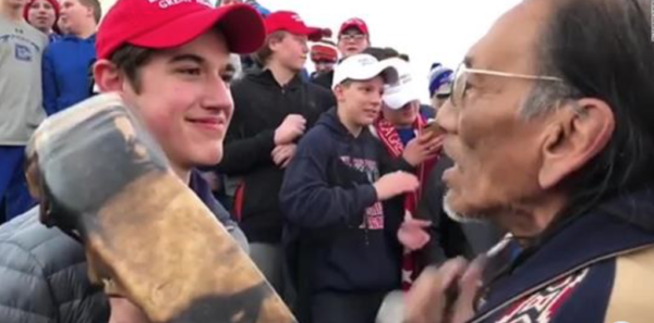 A crowd of teenagers surrounded a Native American elder and other activists and appeared to mock them after Friday’s Indigenous Peoples March at the Lincoln Memorial.Videos of the confrontation show a smiling young man in a red Make America Great Again hat standing directly in front of the man, who was playing a drum and chanting. Other kids could be seen laughing, jumping around and seemingly making fun of the chants.