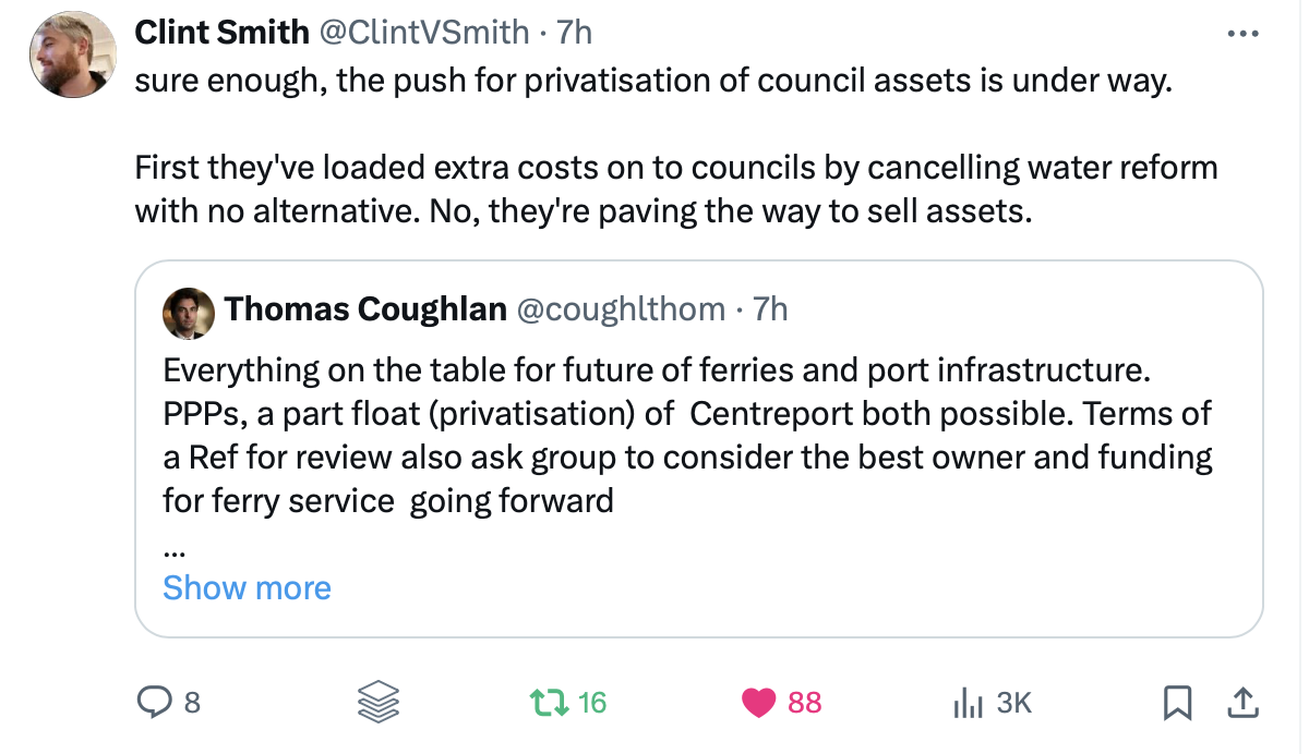 The conga line of crony privatisation capitalism has begun from Trans National Mining interests to privatising local council assets.