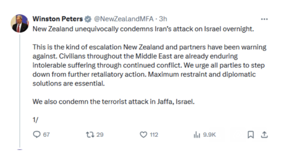 It’s appalling but not surprising to see the New Zealand government condemn Iran’s attack on Israel while refusing to condemn any of Israel’s inflammatory actions designed to provoke Iran into a wider Middle East war.