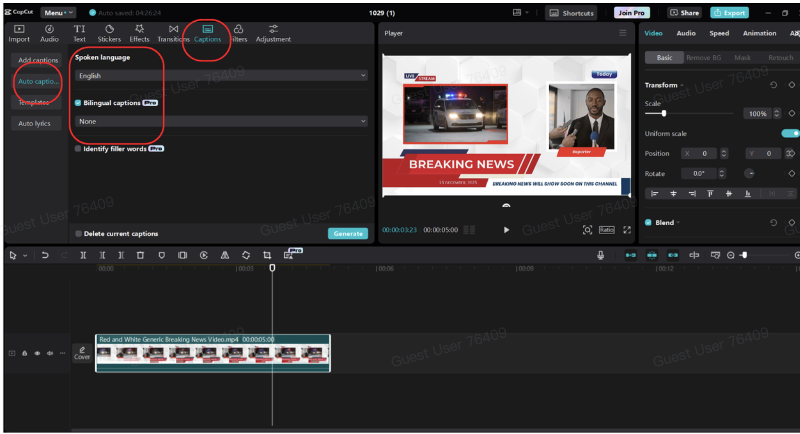 After uploading your video, utilize the AI Caption Generator to automatically transcribe the audio. CapCut’s AI tool generates accurate, time-synced captions, which saves you the hassle of manual transcription. You can further personalize the captions by adjusting the font, color, and size to align with your brand’s aesthetic, as well as positioning them optimally on the screen for better readability. The tool also offers translation options, enabling you to create captions in multiple languages for wider accessibility. If you want to