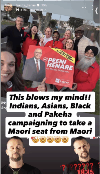 Mr Ferris has a screw loose on his issue, the multi ethnic Labour supporters were trying to help elect a MĀORI candidate in a Māori only seat! Doh. Co leader Debbie has gone out of her way to encourage “tangata Tiriti” non Māori supporters for TPM and issues, dickhead behaviour like Takuta’s is of no assistance.
