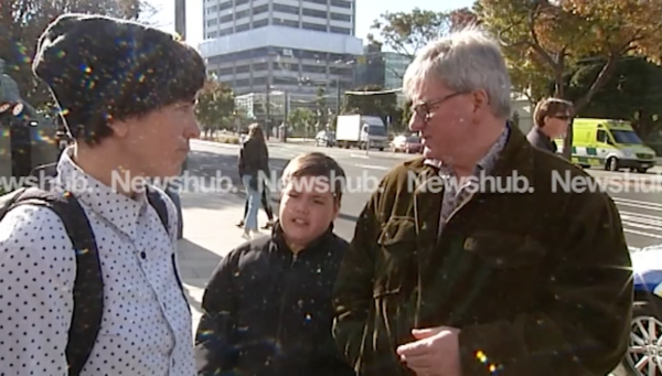 Newshub was interviewing peace activists Ellie Clayton and Laura Drew at the capital’s Anzac Day commemorations when they were interrupted by David Broome, and his 12-year-old-son James Isa-Broome.