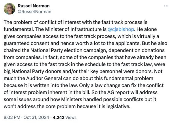 “The whole process around the Fast Track Approvals Bill has been murky. The projects were kept secret, ministers initially would have had the power to override conditions put on projects by an expert panel, and Shane Jones wouldn’t come clean about a meeting he had with mining interests on the West Coast.
