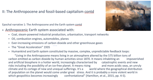 Two epochs we have entered is the Anthropocene where human pollution via carbon is now transforming the very planet we live on and Global Capitalism which is facilitating that global warming.