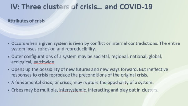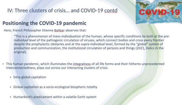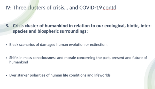 To clarify matters, this presentation considers three major demarcations: the Anthropocene, global capitalism, and the COVID-19 pandemic. The net result, on my analysis, is a three-level crisis complex incorporating global capitalism, the anthropocenic Earth system and the future of humankind. These substantive crisis clusters can also be construed as a crisis of epochal time.