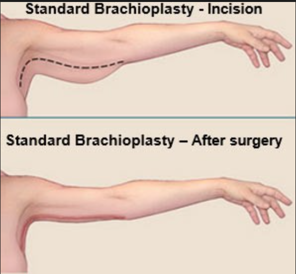The brachioplasty procedure is a plastic surgery that targets this loose and saggy skin. The skin is removed and much more toned arms are the result.