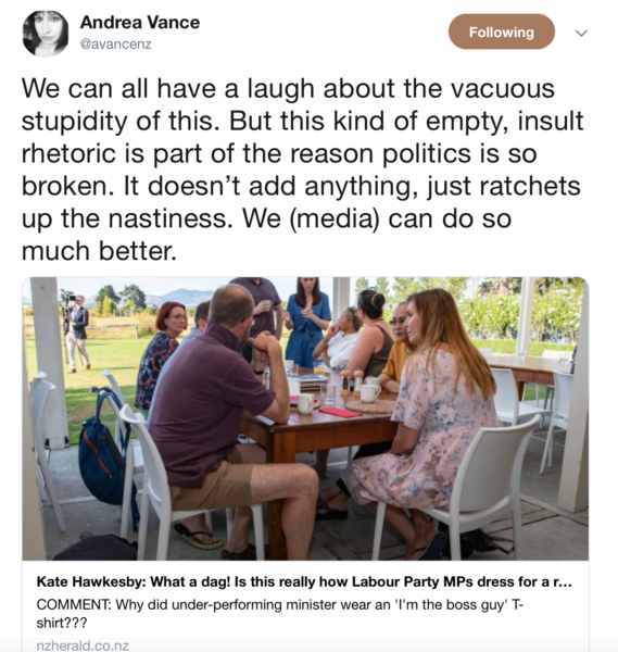 I don’t know why anyone is surprised. This is the sort of thing you can expect from Hawkesby. It’s how her tribe operates. Rummaging through bins in search of the grubbiest scraps to hurl at the opposition. There’s no discussion or meaningful debate around policy. It’s all “Oh my God! Trevor’s such a knob! Look at his trousers!” It’s like her intellectual development completely ceased at around age 14, and she’s forever doomed to be the cliquey mean girl making snide remarks about bad skin and unfortunate haircuts.