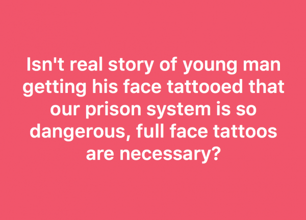 Why hasn’t anyone else pointed out that this young man tattooing his face as a means of protecting him self inside our ultra-violent prison system is a product of a system out of control?