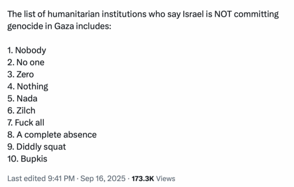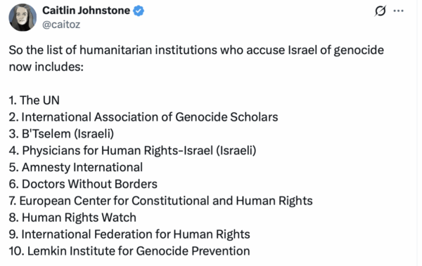 So the list of political institutions in this country who accuse Israel of committing genocide in Gaza includes: