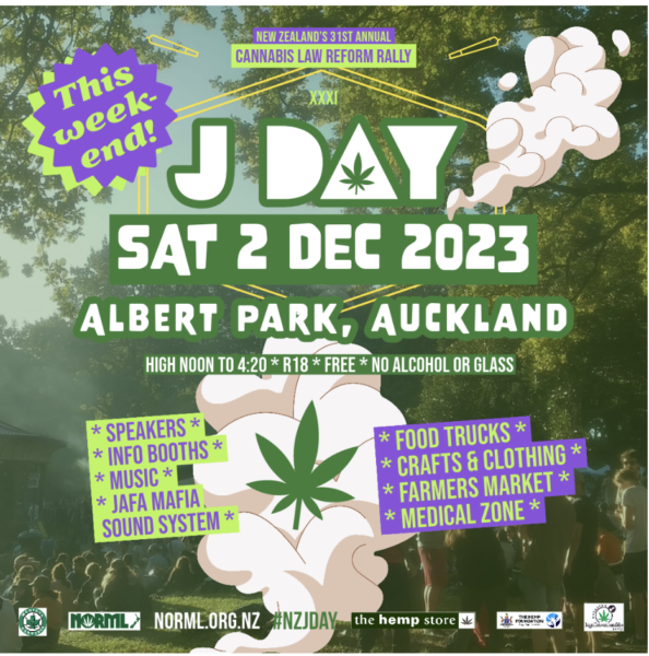 New Zealand’s biggest cannabis event is today. J Day is Auckland’s annual celebration of our Kiwi cannabis culture and a protest against prohibition, held in Albert Park every year since 1992.