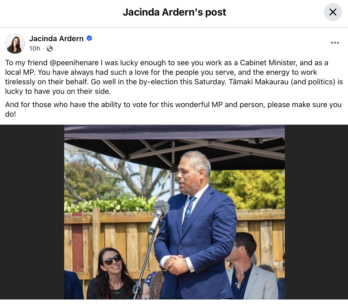 Huge news for Peeni in the final days of the by-election with the endorsement of Jacinda Ardern last night…