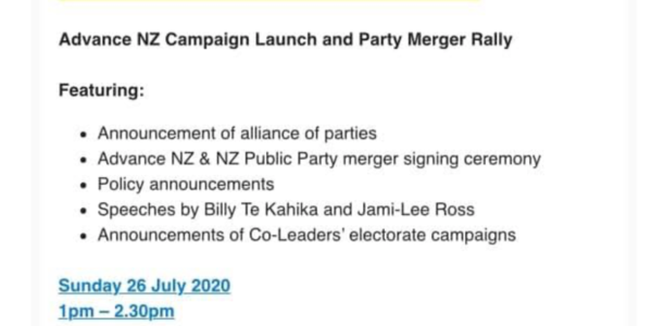Jami Lee-Ross’s last desperate gasp of political relevance vanity project vehicle – Advance NZ, is merging with the conspiracy Party who thinks the Covid 19 virus is a bioengineered weapon and spread by 5G to bring about a shadowy One World Government through the UN???