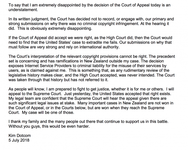 Kim Dotcom Statement on Court of Appeal