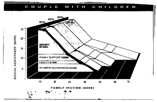 The 1991 budget document ‘Welfare that works’ contained the lie that the technocrats could make tight targeting of social provision work. They devised a complex system of Family accounts. They drew clever diagrams like this one to show how they would make welfare only for the poor by aggregating social assistance of all kinds onto a family based ‘smart card’. When a family increased its income by a dollar, entitlement would reduce by a uniform rate of abatement. Voilà, a miracle.