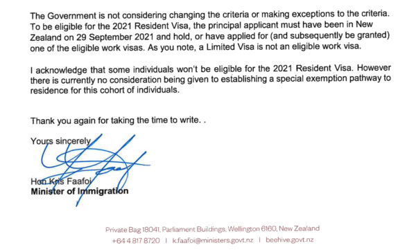 Letter from Hon Kris Faafoi