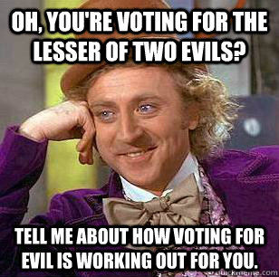 The lesser of two evils, or even just settling for something a bit nicer, is pretty much the reason voter turnout and engagement is so dire.