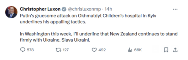 …Luxon has rightly called out and condemned the attack on a children’s hospital in Ukraine which has killed at least 41 people.