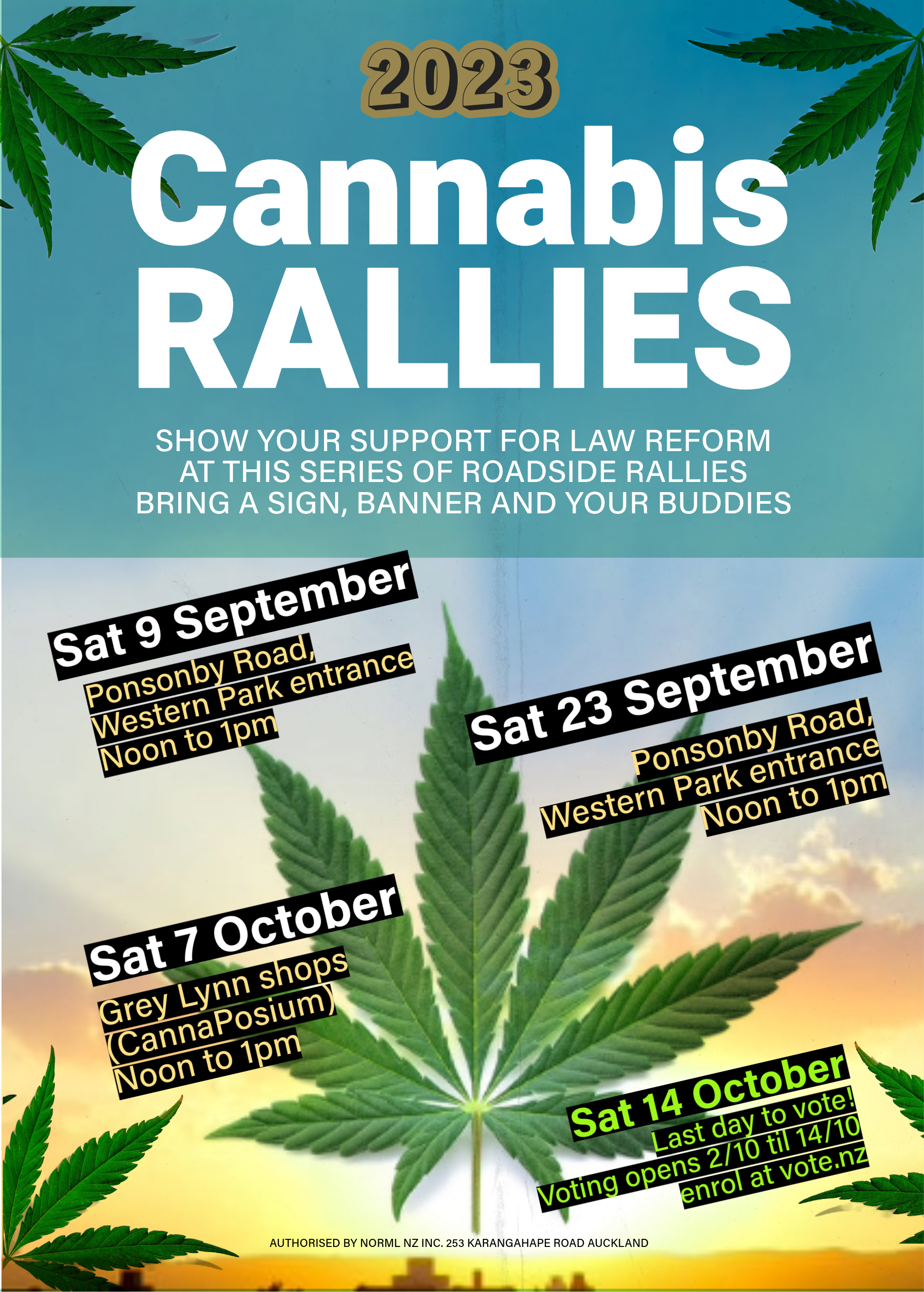 - NORML presents Cannabis Roadside Rallies in Auckland on Sat 9 Sept, Sat 23 Sept & Sat 7 Oct. Details here.
