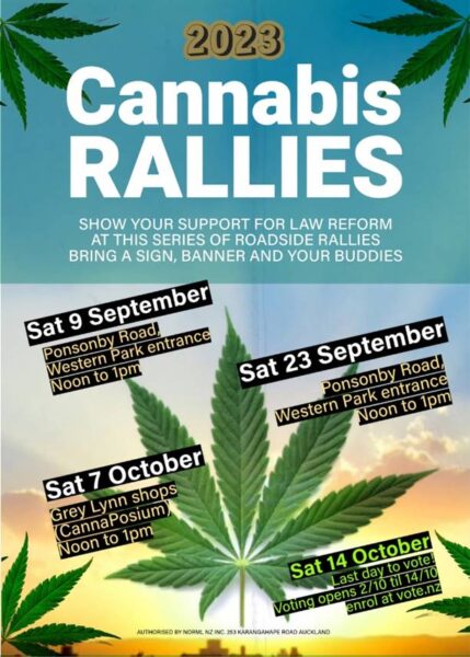- Cannabis Roadside Rallyin Auckland: High Noon Sat 7th October at Grey Lynn shops. See facebook or norml.
