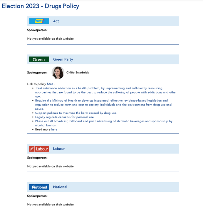 A new policy guide from Interest.co.nz summarises the Greens policy, with Chloe as spokesperson, and also shows ACT, Labour, National, NZ First, Te Pāti Māori and TOP all with policy “Not yet available on their website.”