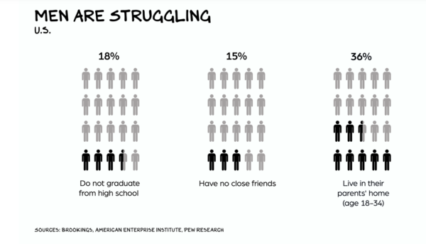 Boys start school less prepared than girls, and they’re less likely to graduate from high school and attend or graduate from college. One in seven men reports having no friends, and three of every four deaths of despair in America — suicides and drug overdoses — are men. I’ve written about this at length here, and about how it relates to declining birth rates here.