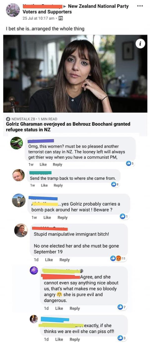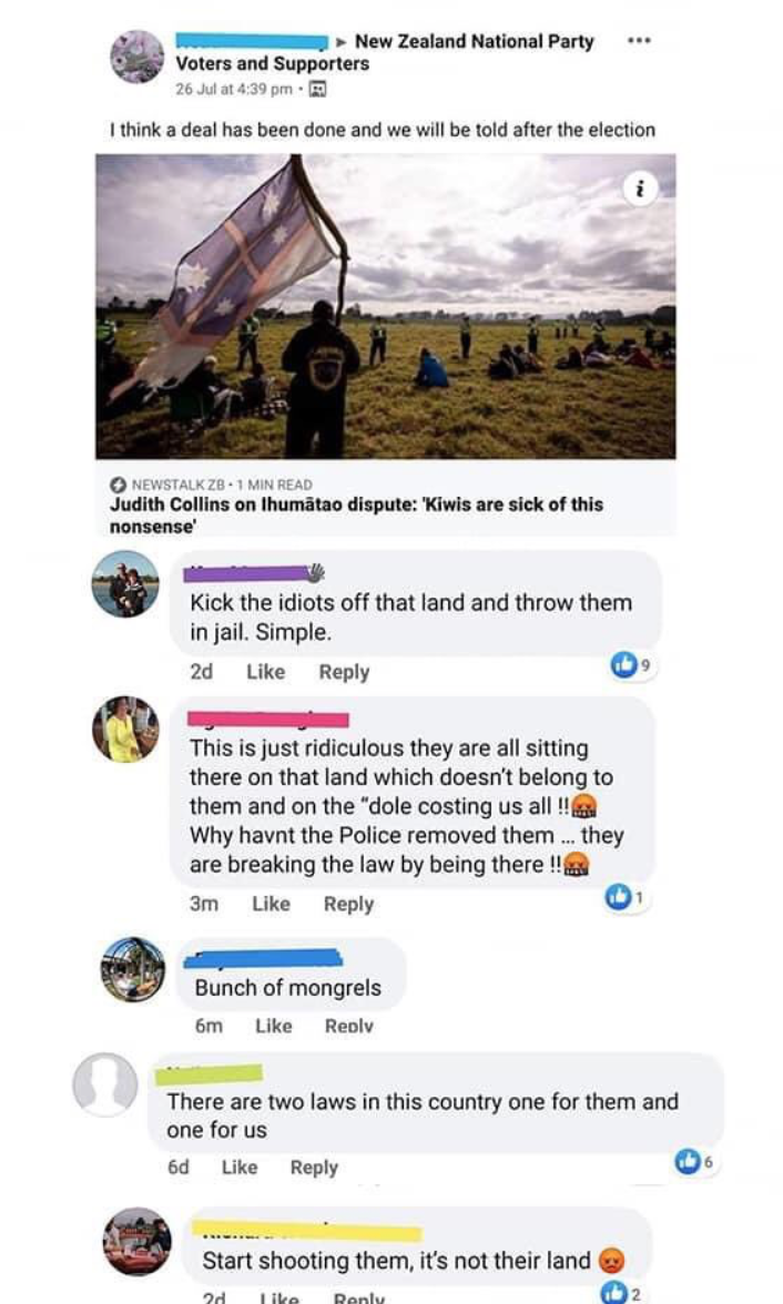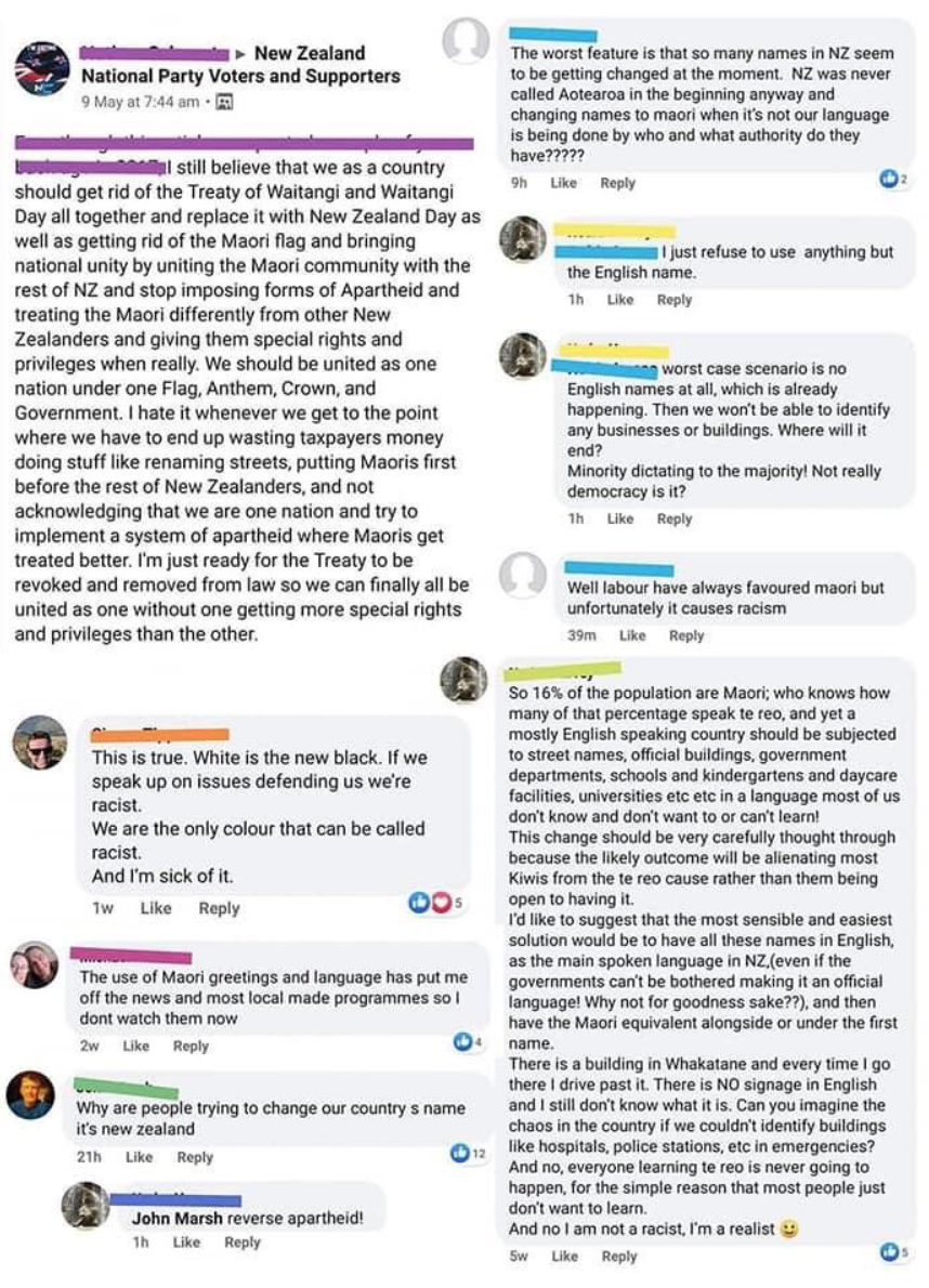 Screenshots from the private New Zealand National Party Voters and Supporters Facebook page – which has more than 3,400 members – show hate speech, racism and sexist comments from the so-called diehard right wing supporters.