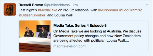 On Media Take we are looking at Australia. We discuss Government policy changes and how New Zealanders are being affected with politician Louisa Wall, founder of The Daily Blog Martyn (Bomber) Bradbury and Broadcaster Alison Mau. Business journalist Rod Oram also talks about the pressures on local journalists from their Australian bosses.