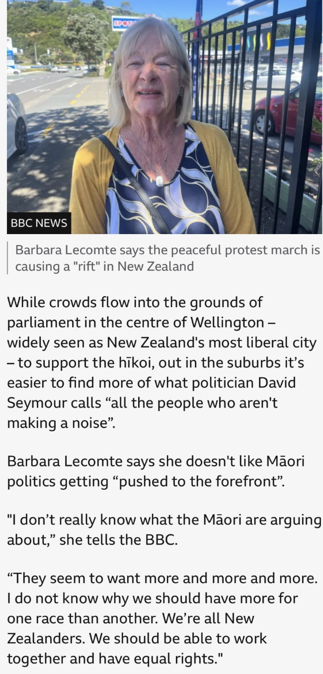We may ask ourselves “Why doesn’t Babs get it?” For that matter, why don’t Christopher Luxon and David Seymour get it? Why don’t colonialists in general get it? The answer is “Because they are colonialists”. They have never been exposed to nationalist sentiment and they have no conception of what nationalism means. The whole colonialist system has worked to conceal it from their gaze. Therefore when it appears right before their eyes one hundred thousand strong they are bewildered. When finally forced to confront the phenomenon they label it “Maori nationalism”. Except that Maori nationalism is New Zealand nationalism and New Zealand nationalism is Maori nationalism. There can be no other kind of nationalism in Aotearoa. When it comes down to it, this is nationalism, pure and simple.