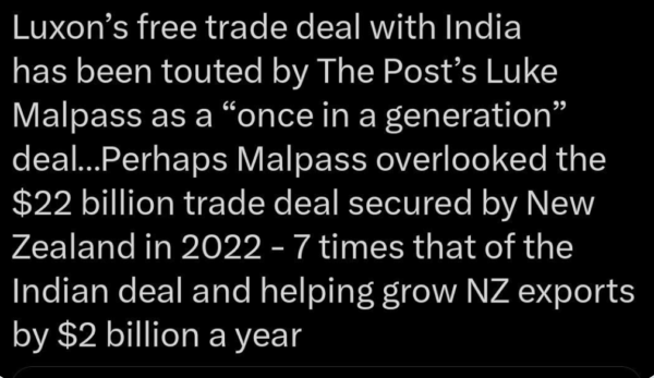 Put aside the enormous issues of India using Free Trade Deals to push immigration, Luke’s slavish devotion to kissing Luxon’s arse manages to miss all the actual work Labour has done on Free Trade deals…