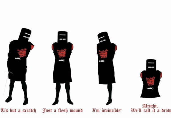 From here on in he’s only allowed to scream, “ALWAYS LOOK ON THE BRIGHTS SIDE OF LIFE”, or, “Tis merely a flesh wound”.