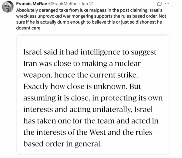 Luke is bang on the money. Israel acts for the West, hence why we see very little, if any, criticism of Israel from NZ government, ditto Western governments in general. Likewise, all mainstream media acts for their governments, hence why we have people like Luke. We are the rules based order and the mainstream media exists to push our message and neuter criticism of these messages.