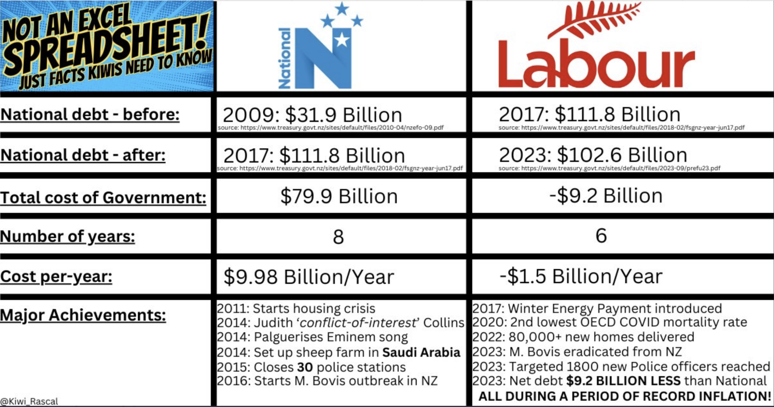 Nice spreadsheet summary. You could add to that, the fact that National is pinning its hopes on boosting peoples incomes by a measly block of cheese a week using modeling that its keeping secret, with a new foreigner tax which may be illegal, and economists pointing out a half billion dollar per year, fiscal hole in their figures, is kindergarten stuff.