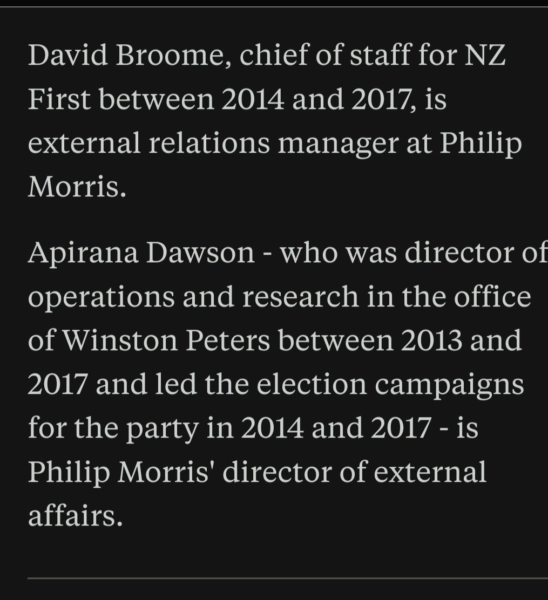 NZ First Chief of staff works for Big Tobacco = no conflict of interest.