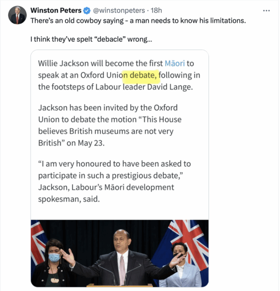 3. How pathetic and disingenuous of David Seymour to imply that he had earlier been unaware of Willie Jackson’s participation and win at the Oxford Union debate last year.
