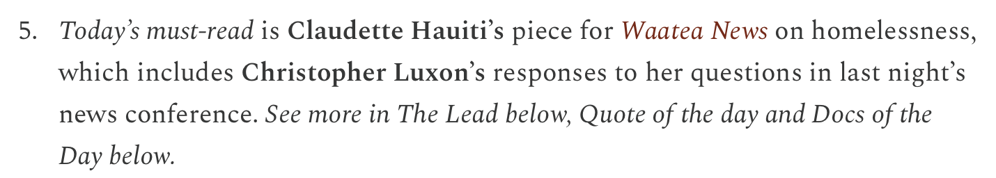 …Claudette’s most recent expose last week on homelessness in Rotorua where she slept the night in her car alongside them is harrowing and horrifically insightful journalism at its best.
