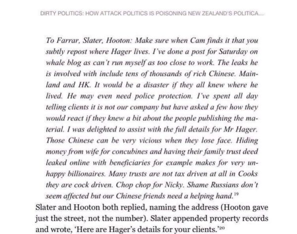 Chop chop indeed. ANYTHING Hoots has to say about dirty politics and abuses against journalists needs to be set against the fact he was providing the address of Nicky Hager to have him dealt to by Chinese organised crime.