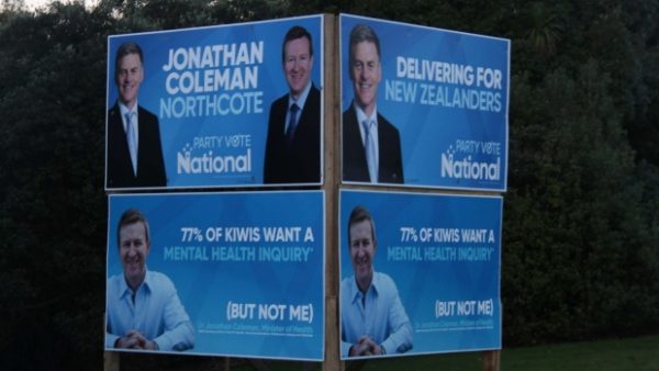 The signs satirise National Party’s billboards and feature an image of Minister Coleman with the slogan ‘77% of Kiwis want a mental health inquiry (But not me) – Dr Jonathan Coleman, Minister of Health’.