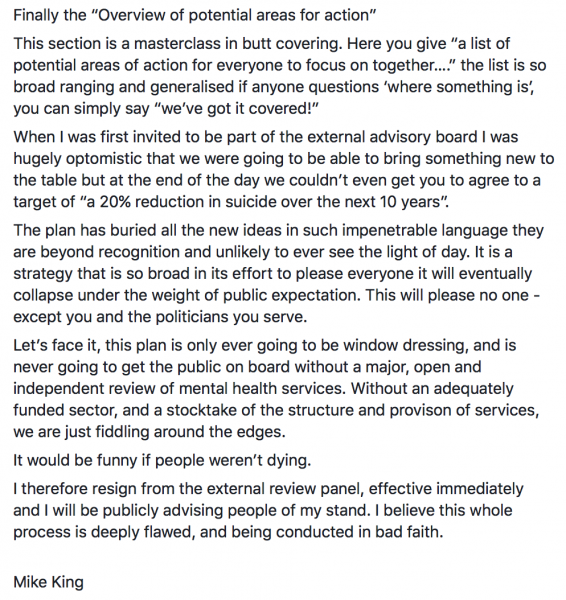 For him to quit the suicide-prevention panel because they won’t even look at a 20% reduction is outrageous and simply further proof of how this government get community leaders to buy into their bullshit and then simply ignore their voice when the goals are set.