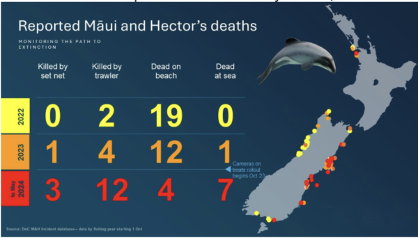Emeritus Professor Dr Liz Slooten, a world expert in Māui and Hector’s dolphins, says “These deaths are just the tip of the iceberg. Since the roll out of cameras on fishing boats, reported fishing industry caused dolphin deaths have gone from two in the 2022 fishing year to 15 so far this fishing year.