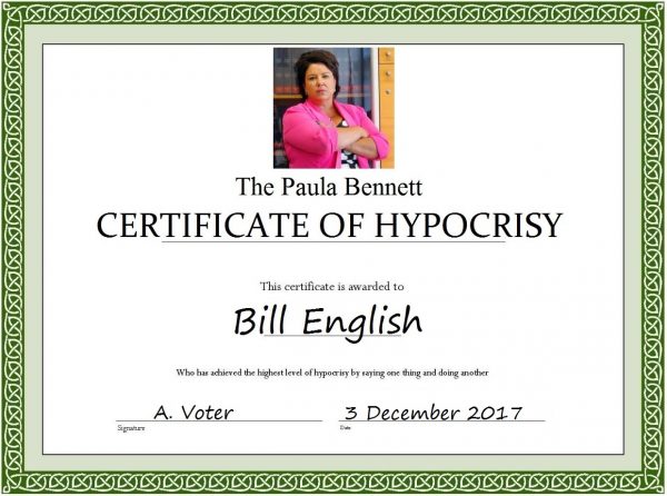 The first Award goes to Bill English, for saying one thing and doing another. Congratulations, Mr English!
